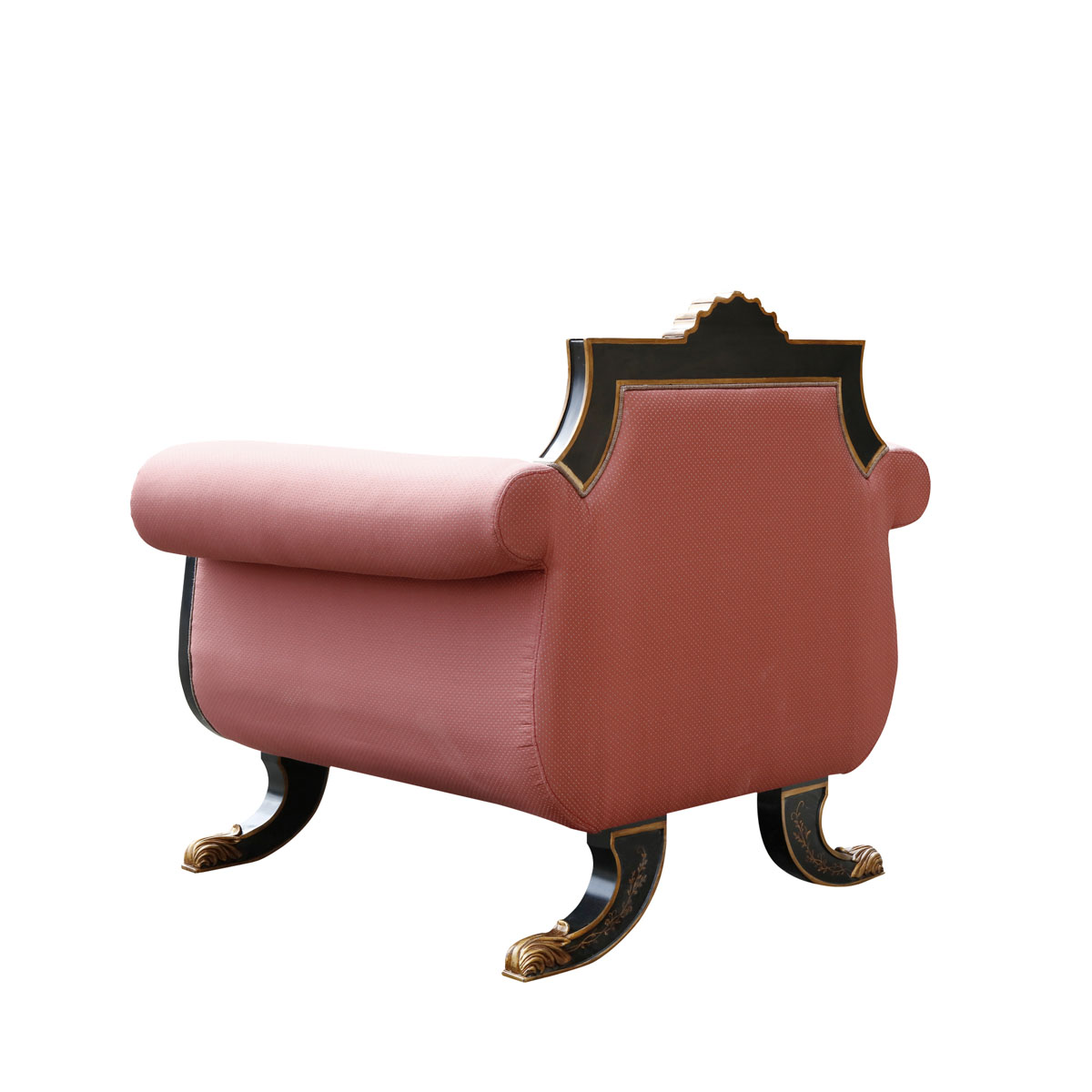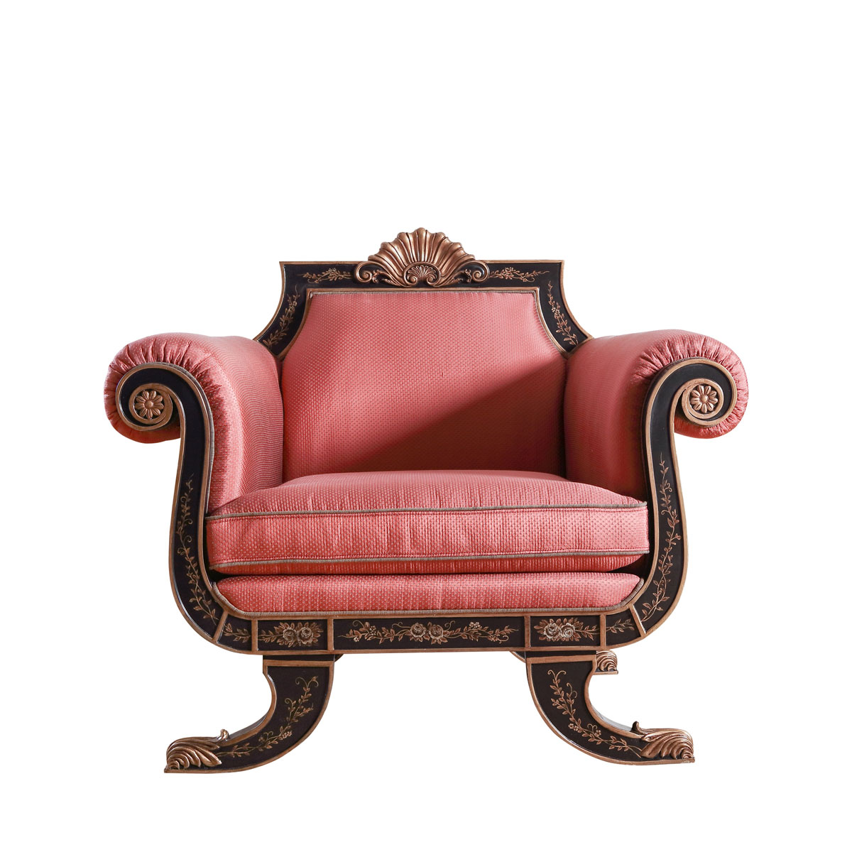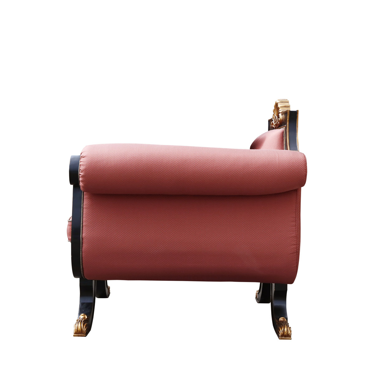 沙發(fā)采用五月花號輪船的造型,兩卷軸扶手向外翻轉(zhuǎn),纖細(xì)的四個彎腿支撐,粗中有細(xì),體現(xiàn)出航海的自由與勇敢,紅色的面料配黑色手繪的邊框,典型的中西文化合壁,典雅穩(wěn)重又倍顯多元文化的交匯融合。